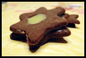 Lorsque j’ai essayé cette recette , j’ai pris des emporte piéces en étoile. C’est une mauvaise idée car ce n’est pas simple de repartir la ganache de façon homogéne sur cette forme et les deux sablés ne se superposent pas trés bien. Mieux vaut prendre des formes plus simples.