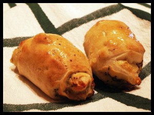Badigeonnez-la de miel ou sirop d’erable ou soupoudrez-la un peu de sucre. Placez sur la pâte ce de quoi vous voulez la garnir. Roulez la pâte sur elle-même dans le sens de la longueur et coupez chaque boudin en 8 tronçons environ.