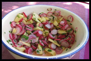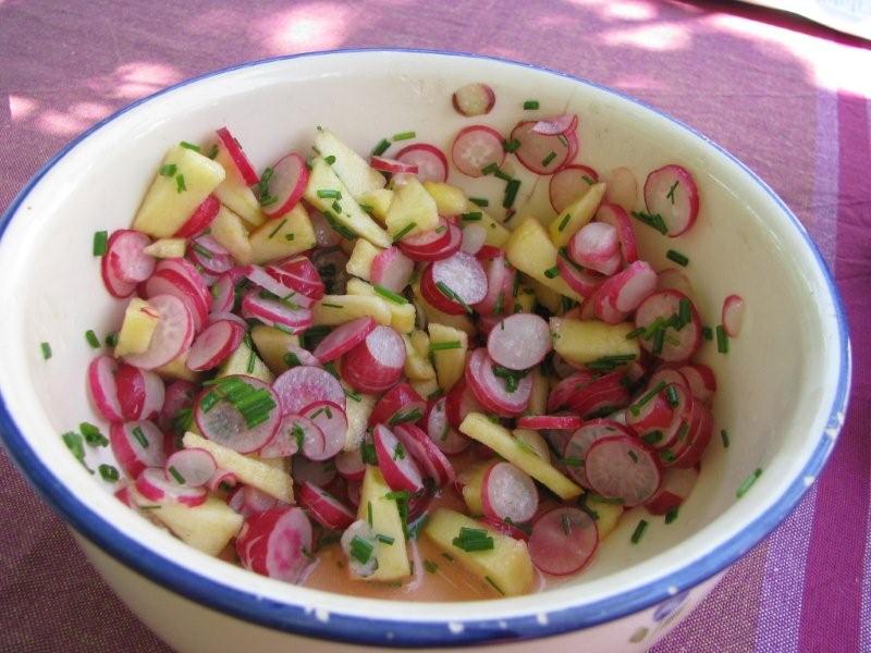 Emincez finement les radis roses et la pomme, citronnez, arrosez avec une cuillère à soupe d’huile de noisette.