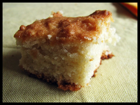 Versez la pâte dans le moule et tapez le fond sur le plan de travail afin de bien éliminer les bulles. Glissez le moule au four et laissez cuire de 40 à 45 min. Laissez complètement refroidir le gâteau avant de le démouler. Présentez-le coupé en carrés, accompagnez cette pâtisserie d’un savennières, servi aux alentours de 12 °C.