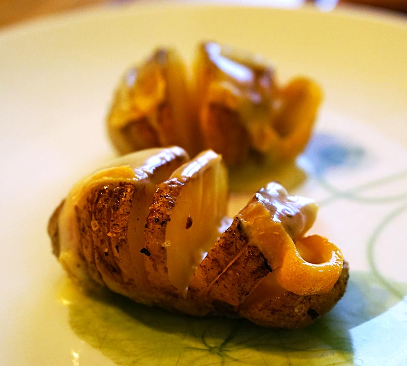 2. Sans les éplucher, couper chaque pomme de terre en tranches fines (environ 3 mm) mais pas jusqu’au bout, ce qui permet à la pomme de terre de s’ouvrir comme un éventail lors de la cuisson.