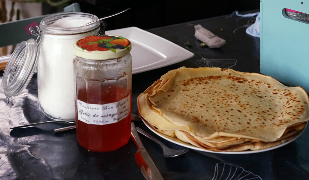 Cette pâte à crêpes n’est pas sucrée. On peut dont aussi bien garnir les crêpes d’aliments salés que sucrés selon les envies. Si on réalise des crêpes pour le goûter, on peut alors ajouter une ou deux cuillères à soupe de sucre.