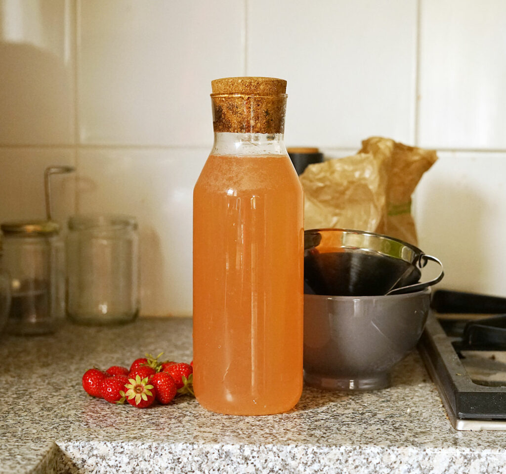 Transférer dans une bouteille et ajouter un peu de sucre en poudre pour casser l’acidité… mais ce n’est pas obligatoire.