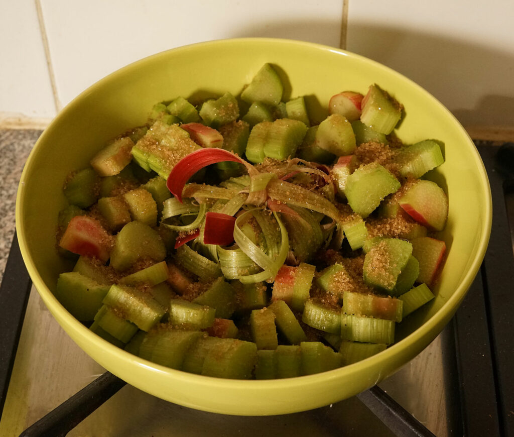 Attendre au moins une heure pour que la rhubarbe rende son eau. Ça fait une sorte de flaque au fond du saladier.